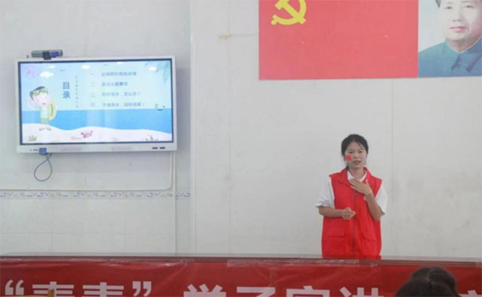安全重于泰山,生命重于一切。習近平總書記強調,以硬實之舉筑牢安全防線,以“時時放心不下”的責任感扎實做好嚴防學生溺水工作,守護青少年兒童生命安全、健康成長。“暑期高溫,大家想不想去痛痛快快地游個泳?”“想……”“我們可以獨自下河游泳嗎?”“不可以!”隊員們通過PPT講解與師生互動問答相結合的方式,將孩子們的注意力集中到防溺水教育課上。隊員們將一個個痛心的案例、防溺水視頻與“四個牢記”“六個不準”等安全知識教育牢牢結合,結合自身成長與網上查找資料分享了自救與獲救的故事,為孩子們撐起防溺水“安全傘”,讓孩子們認識到防溺水知識是暑期生活中必不可缺的知識。