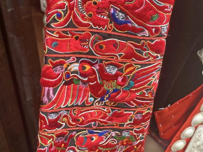 為深入了解黔東南民族文化和苗繡相關非遺文化,實踐團成員在提前預約后參觀了位于丹寨萬達小鎮(zhèn)的歐東花非遺苗繡博物館。歐東花是一位致力于苗族文化傳承發(fā)展的苗族婦女,是國家級非遺項目苗繡傳承人。她用三十年的時間走村串寨,保留了萬余件苗繡藏品。在實踐中,實踐團成員近距離欣賞了博物館內(nèi)的藏品,包括臺江施洞苗族服飾盛裝、丹寨錦雞苗族盛裝、丹寨白領苗盛裝、各類苗繡圖樣等。通過參觀精美豐富的苗繡藏品,實踐團成員們了解了在不同時期不同地域的苗族服飾特點和苗族文化歷史。博物館不僅陳列了苗繡相關藏品,也開發(fā)了苗繡相關的文創(chuàng)產(chǎn)品和旅拍服務,發(fā)展民族文化產(chǎn)業(yè),以產(chǎn)業(yè)發(fā)展收益反哺民族文化保護和博物館發(fā)展。