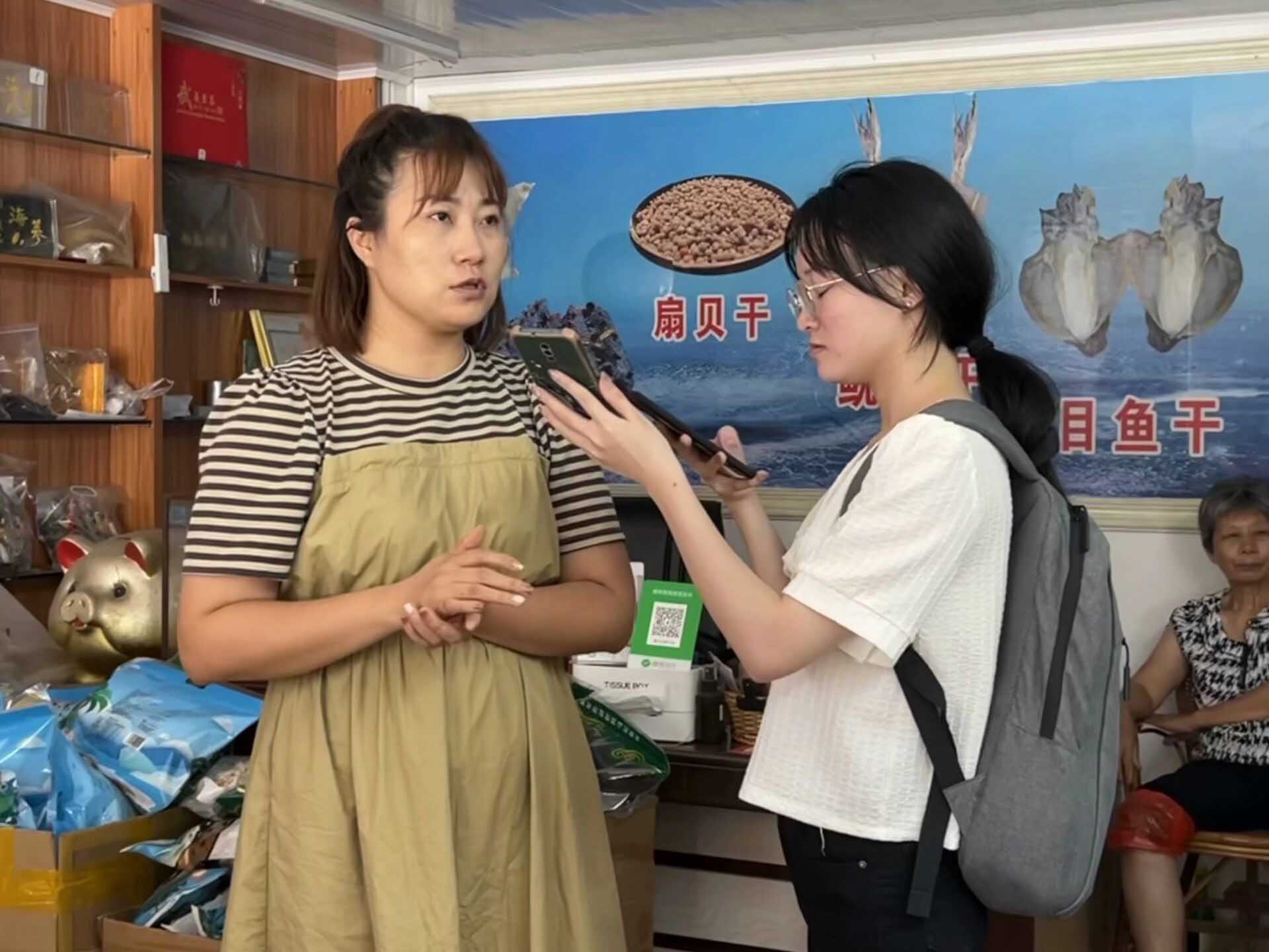 8號上午9:00,實踐隊前往銅陵鎮商業街,參觀當地水產干貨店鋪,在取得當地商鋪老板的準許后,隊員們品嘗不同品類的海鮮干品,并在店鋪老板的介紹下了解不同種類的水產干品,例如魷魚干、巴浪魚干、紫菜等多種干品。同時,店鋪老板也向我們分享了他們的銷售渠道以及銷售狀況,提到了要結合旅游產業以及借助電商經營模式,將干品銷售給游客并傳播至全國各地。