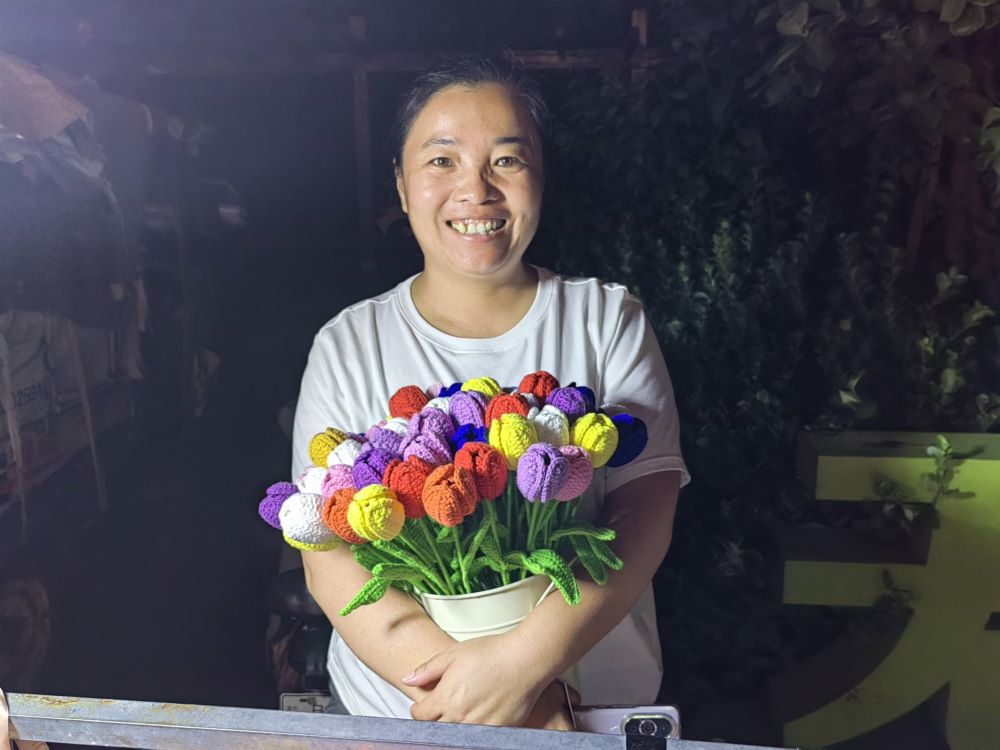 圖為蘇家莊村村民展示蠟線編織作品