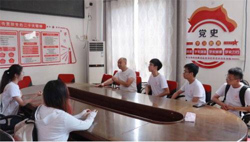 圖為實踐隊員與泊頭村主任在會議室展開有關扶貧情況交流