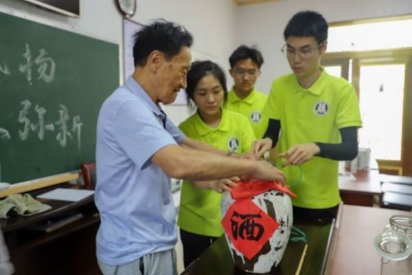 “先蒸米,再把蒸好的米按搓揉壓……”舟山螺門村的老教師蘇國方先生正與實踐團成員共同釀制米酒,希望用這種特別的方式共存這一份五老歲月經(jīng)過沉淀的似酒醇香。