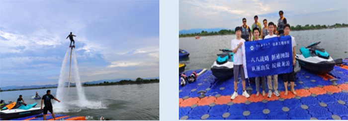 作為一個伴水而居的村莊,近幾年團石村也特別注重發展“水經濟”,水上娛樂項目吸引著無數游客前來。實踐團參觀了村內的日月灘水上運動中心,體驗了一把驚險刺激的水上運動。中心負責人介紹,日月灘水上運動中心毗鄰湖泊和山脈,環境優美。這里設有先進的設施和豐富多樣的水上項目,盡可能為游客帶來難忘的游玩體驗。中心提供了多種水上運動項目,如帆板運動、水上滑行、水上噴射等,同時為了保障游客的安全,還會有專業教練引導游客操作,岸邊也配有救生員巡邏。