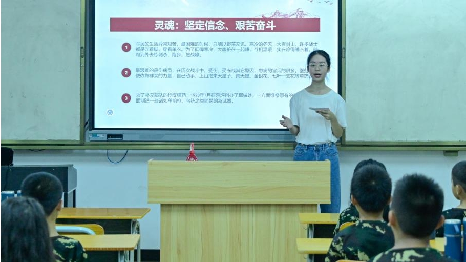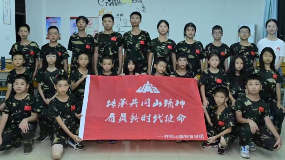 為深入學(xué)習(xí)宣傳貫徹習(xí)近平新時代中國特色社會主義思想和黨的二十大精神,引導(dǎo)青少年傳承弘揚革命先烈不畏艱苦、甘于奉獻的愛國主義情懷,深刻體會國家富強、民族復(fù)興道路的艱辛和不易。“金色麥田”志愿服務(wù)宣講團為小朋友們組織了一場“傳承井岡山精神”宣講會,宣講團成員以生動有趣的課堂形式,帶領(lǐng)小朋友們深入學(xué)習(xí)并傳承井岡山精神,引導(dǎo)他們牢記歷史、勇?lián)姑?br /> 2023年7月,河南工業(yè)大學(xué)新聞與傳播學(xué)院“金色麥田”志愿服務(wù)宣講團成員來到廣西育苗軍事夏令營,為孩子們開展了一次志愿宣講活動,傳承和宣傳井岡山精神。課堂上,團隊成員通過文稿演示、歷史圖片、歷史故事、視頻等多元化的宣講形式,向孩子們生動介紹了井岡山的歷史故事及其紅色精神。
