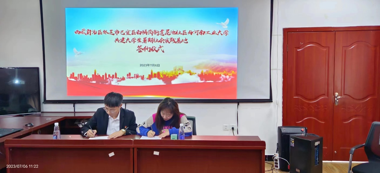 本網(wǎng)7月6日電(通訊員:秦夢杰 符策吉)2023年7月6日,河南工業(yè)大學(xué)與西藏自治區(qū)林芝市巴宜區(qū)白馬崗村街道尼池社區(qū)達(dá)成社會實踐基地合作的簽約儀式在巴宜區(qū)白瑪崗街道辦事處尼池社區(qū)退役軍人服務(wù)站舉行。尼池社區(qū)駐村第一書記譚利、社區(qū)工作人員,河南工業(yè)大學(xué)“鄭在林芝 愛在工布”赴西藏社會實踐團隊的全體成員出席簽約儀式。