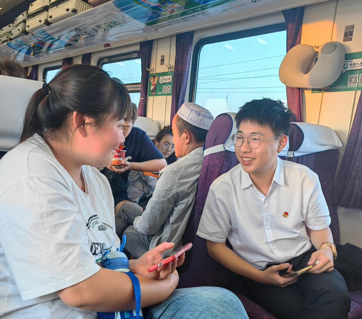 閑嘮家常會民情這一路上,團隊成員與同行的旅客朋友們相談甚歡,在列車途徑各個站點的青藏線旅途中,與不同的旅客“面對面,心貼心”的交流,閑聊家常的同時,了解民情農(nóng)情,為后續(xù)社會實踐打下堅實基礎。正所謂“知屋漏者在檐下,知政失者在朝野”,只有深入群眾、與群眾貼心交談,才能發(fā)現(xiàn)當?shù)厝罕姷墓残詥栴}和亟待解決的需求。而深入群眾不僅僅是拿著筆記本入戶走訪,是田間地頭邊干農(nóng)活邊嘮嗑,也是漫長旅途中的閑談,是吃農(nóng)家飯聽農(nóng)家事,也是走街串巷多聽細看,才能真正把好事辦實,把實事辦好,才是團隊遠赴西藏的初心所在。