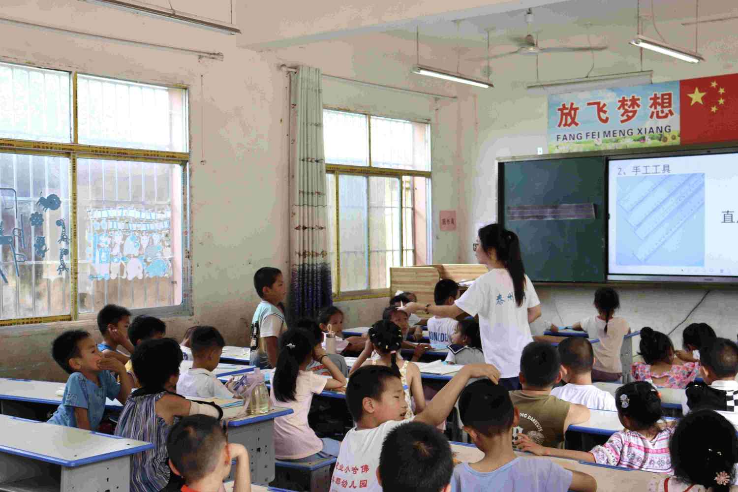 圖為支教地點(diǎn)教室,徐妍璐小老師著重強(qiáng)調(diào)使用手工工具的安全事項(xiàng)等問題,做好手工制作的前期工作。