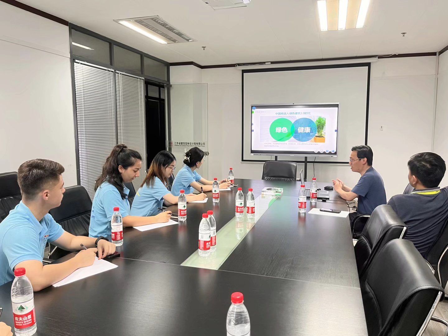 隨后,張聰博士通過闡述江蘇省內綠色環保發展現狀,結合公司內部建筑建設特長,以綠色建筑為著眼點,將事先準備好的幻燈片向實踐團成員們展示,供成員們對于綠色發展和綠色建筑概念進行初步的了解。通過對于綠色建筑概述及政策、綠色建筑新舊標準對比、綠色建筑設計階段解讀和綠色建筑相關技術四個方面的講解,實踐團深刻意識到國家對于“2025年實現碳達峰、2030年實現碳中和”的宏偉目標做出的巨大努力,江蘇省在綠色環保方面處于領頭先列。要實現江蘇與新疆地區的對口幫扶,不能空有規劃而無實際進展;不能空喊口號而不規劃落實,為發揚當代大學生吃苦耐勞的優秀品質,響應習近平總書記鼓勵大學生“三下鄉”、“返家鄉”的政策號召,實踐團將深入新疆地區,謀求自身進步和地區發展的雙向共贏。