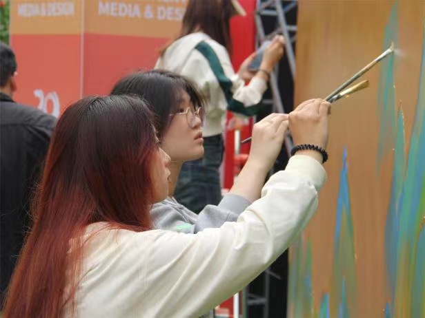 福州大學至誠學院2022級產品設計01班團支部的同學們在創意樓前與校友們共同完成《千里江山圖》最后一抹青綠,為至誠華誕獻上祝福。