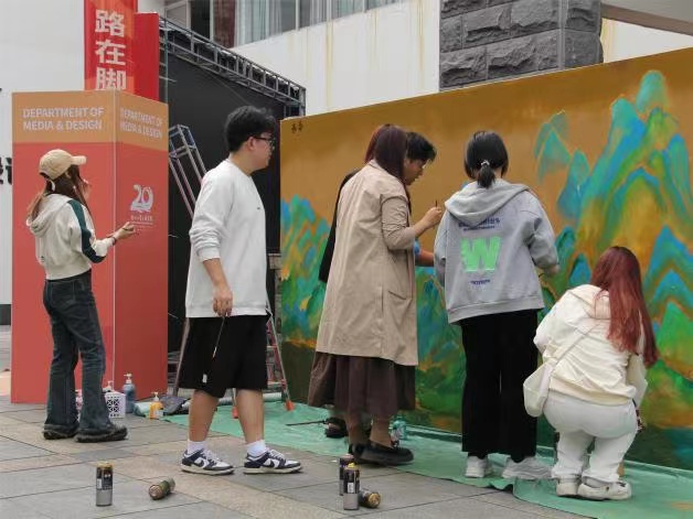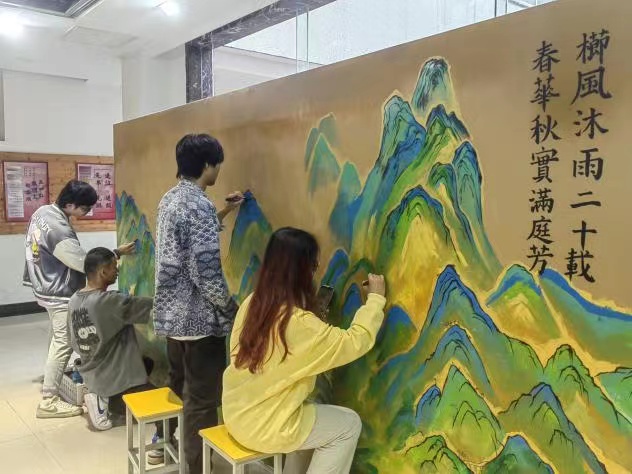 福州大學至誠學院2022級產品設計01班團支部的同學們于2023年10月21日在創意樓前以長卷共繪《千里江山圖》的形式