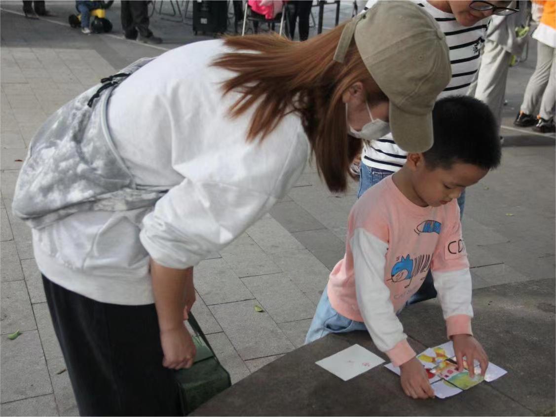志愿者們有序引導大小朋友們,進行亞運會吉祥物趣味拼圖活動,并