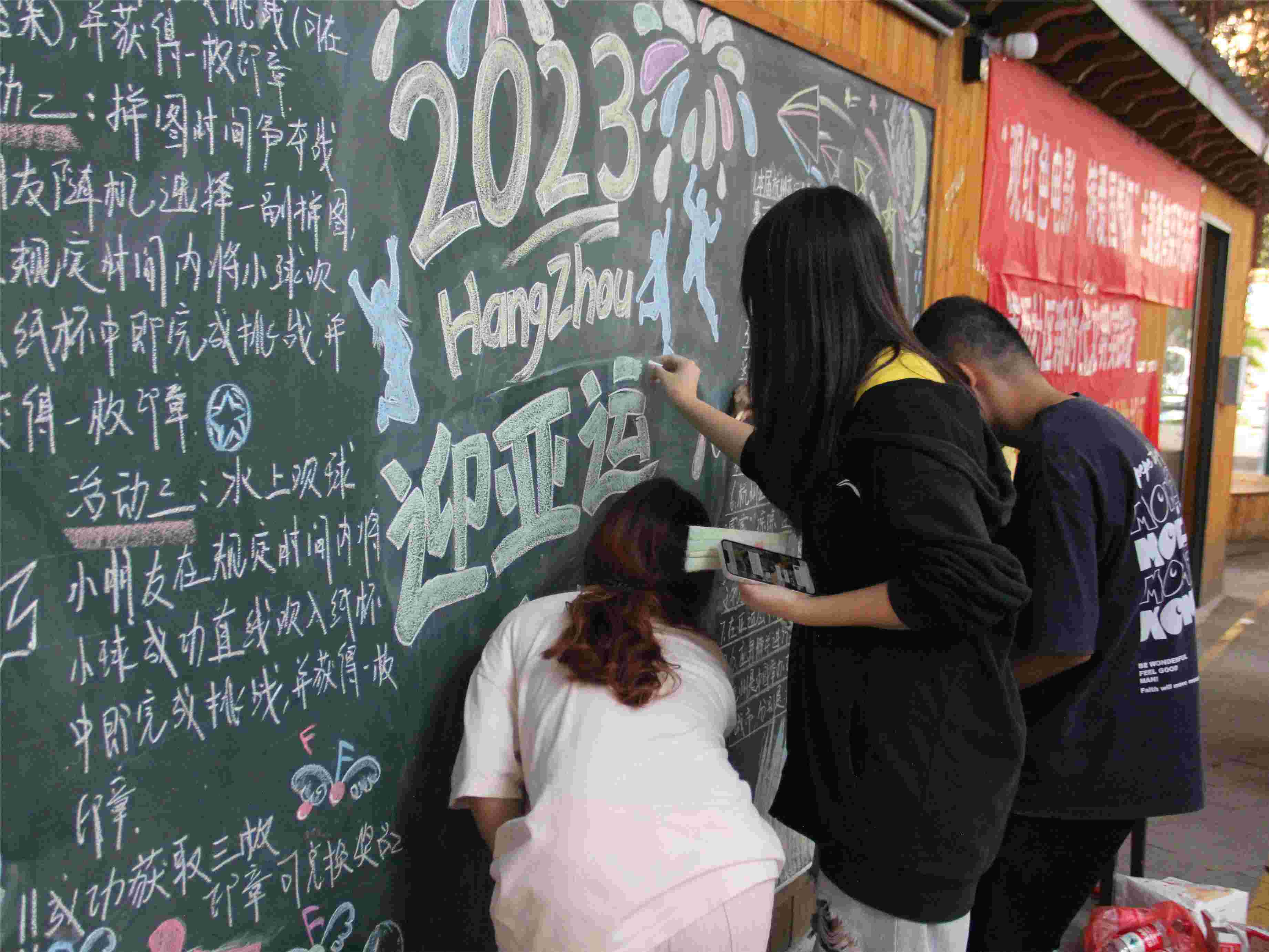 至誠青年們發揮產品設計專業特長,將專業知識學以致用,設計繪制“慶亞運,宴精彩”主題黑板報,為社區活動進行預熱,以黑板報為載體,將亞運知識宣傳至社區。