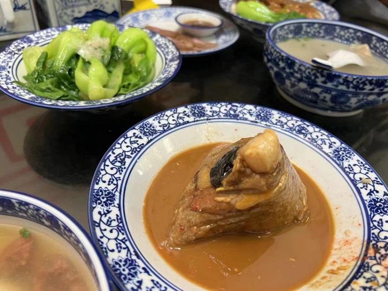 第一站,實(shí)踐隊(duì)來到了“侯阿婆燒肉粽”品嘗泉州特色小吃。泉州肉粽制作技藝,于2013年被列入泉州市第四批非物質(zhì)文化遺產(chǎn)保護(hù)名錄。“燒肉粽”的特色在于“燒”,在閩南語中“燒”取“熱”之意,即肉粽要趁熱吃。肉粽以糯米為主食,中間裹以五花肉、雞蛋、香菇等餡料,經(jīng)粽葉包成“四面體”狀,蒸煮后配以甜辣醬或花生醬食用。為了使肉粽符合大眾口味,老板保留了原有風(fēng)味,并加入蓮子、板栗、蝦仁、干貝、鮑魚等閩南特色干貨,讓食客剝開兩片粽葉便賞味萬里山海。為打開“老字號”走出去的大門,他們結(jié)合現(xiàn)代信息傳播媒體,展示泉州“燒肉粽”的品質(zhì)以及傳承的真心,將肉粽品牌推廣到主流電商平臺,為傳統(tǒng)肉粽尋找新的生機(jī)。