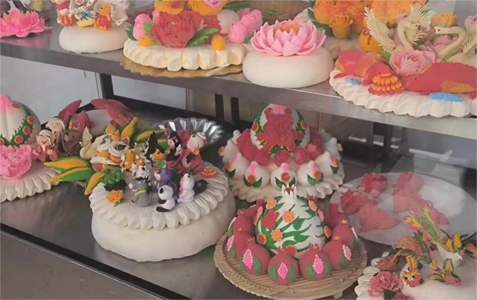 工作人員搟皮、壓模,林老師進行組裝、整形。這是林老師最近在忙的一個項目,是通過黏土塑代替面塑,用面塑手藝制作出龍頭花餑餑模型,用于新年活動的展示。跟隨林老師的腳步,我們看到了尚未完工的龍頭造型,林老師一邊進行制作,一邊向我們介紹。林老師從小受家里環境影響,父母在家做花餑餑,慢慢地,他也開始對花餑餑感興趣,并決定將其做得越來越好,將非遺花餑餑傳承下去。花餑餑的制作,步驟并不簡單。需要先進行調面和面,在發酵、整形,整完形后裝飾,然后需二次發酵,再進行蒸熟。蒸熟后進行裝飾,就可以得到成品。這其中,發酵和整形是兩大難點。發酵是新手做花餑餑的第一個難題,發酵程度有輕有重,需把控好度,否則蒸熟后就會出現問題。而整形則需要手藝,若手藝不精不細,那么制作出來的造型就會不好看,因此需要長期的練習。