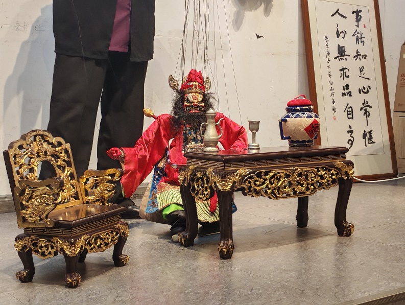 以木偶為媒介,以歌舞演故事,以懸絲操縱古今。提線木偶戲的表演主要依靠演師用手指牽動懸絲來完成,其精湛、繁雜而準確的操線功夫讓表演惟妙惟肖,妙趣橫生。小小的偶人被演員賦予生命的溫度,演繹著人世間的悲歡與冷暖。木偶劇團表演了《鐘馗醉酒》、《小沙彌下山》,其深厚的文化底蘊、精湛的操演技藝、髙亢的傀儡腔調,令現場觀眾蕩氣回腸,實踐隊在木偶線的舞動中切身感受民間表演藝術魅力。圖為《鐘馗醉酒》表演