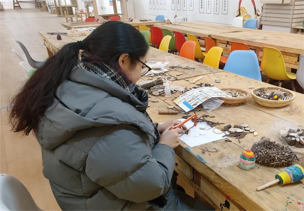 圖為實踐隊員體驗?zāi)拘婢咧谱鞴に嚒?nbsp;中國青年網(wǎng)通訊員 解帆 供圖