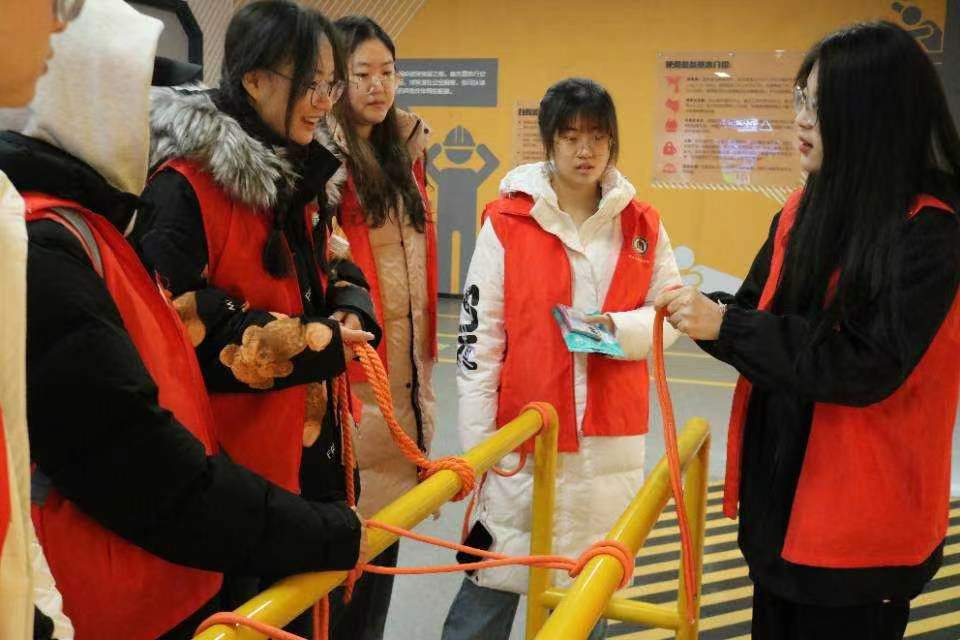 在參觀過程中,實踐隊隊員們不僅參觀了國家防護體系的組成與發(fā)展情況,還親身體驗了模擬自然災(zāi)害的諾亞方舟及學(xué)習(xí)了逃生繩結(jié)的打結(jié)步驟。