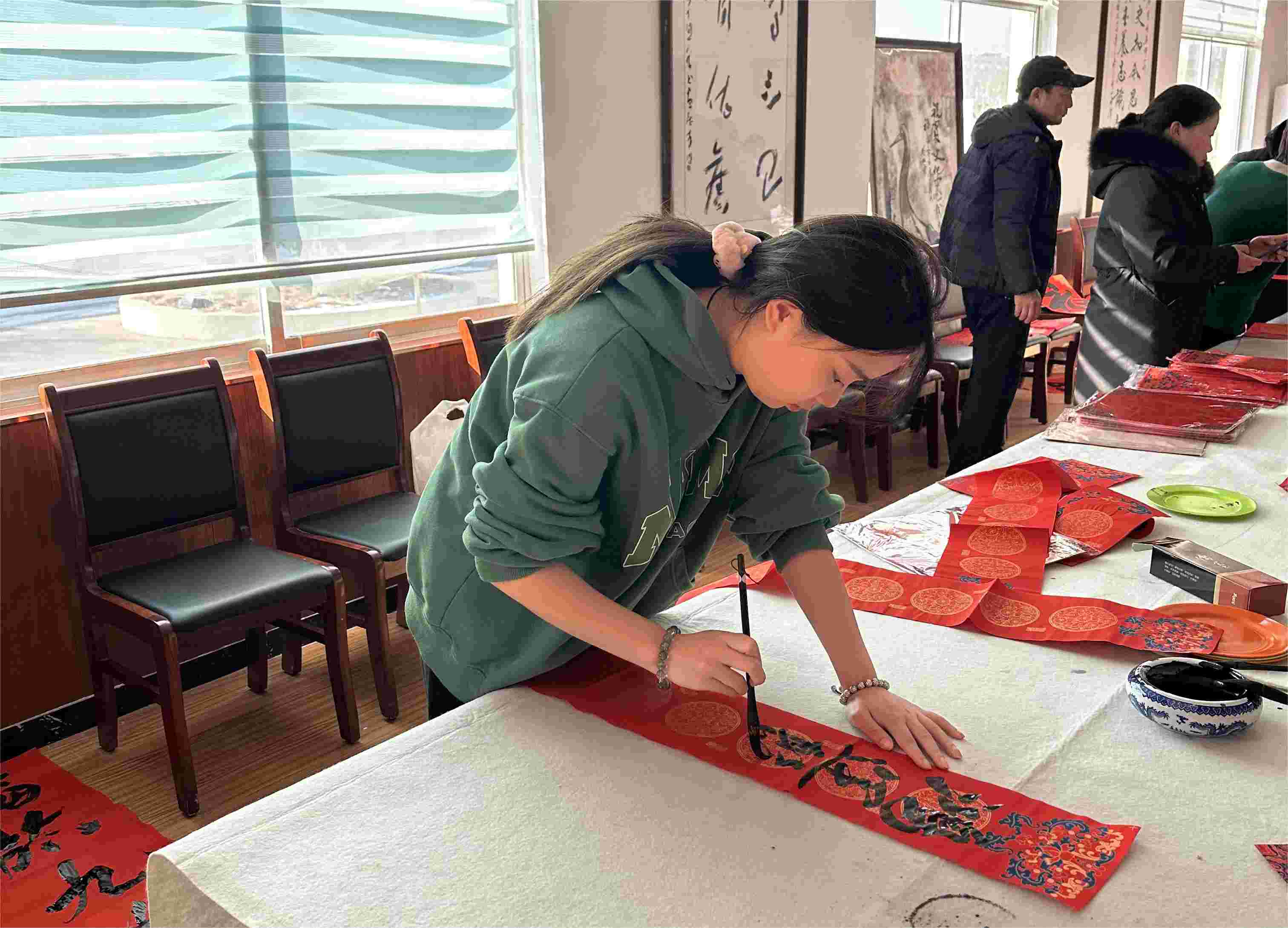 臨近春節(jié),春聯(lián)是家家戶戶必不可少的東西,不僅增加了節(jié)日的喜慶氛圍,更讓村民們在潛移默化中體驗(yàn)到書法的魅力。活動(dòng)開始后,實(shí)踐隊(duì)隊(duì)員們揮毫潑墨,將自己的美好祝福和心愿融入春聯(lián)當(dāng)中。他們筆法嫻熟、氣韻生動(dòng),紙上的字時(shí)而剛勁有力,時(shí)而婉轉(zhuǎn)流暢,時(shí)而端莊秀麗,充分展現(xiàn)了每個(gè)實(shí)踐隊(duì)隊(duì)員深厚的藝術(shù)功底和獨(dú)特的書寫風(fēng)格。