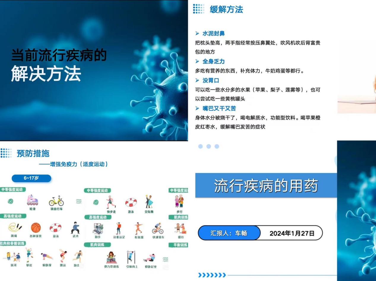 宣講活動開始,王李燕同學面對面為居民從流行病定義、特點、傳播方式及現狀詳細講解流行性疾病背景的相關知識,并分發了常見流行性疾病紙質科普小冊,以引導大家正確認識常見流行性疾病。楊沁怡同學通過常見預防方式以及緩解方式等方法來向大家介紹了當前流行疾病的解決方法,主要以疫苗接種、勤戴口罩、保持社交距離、科學運動、適量飲食等普遍方式來具體講解如何預防流行疾病。引導大家積極預防流行性疾病;最后,車暢同學具體介紹了甲乙流、新冠及支原體肺炎這四種常見流行性疾病的發展過程、相關癥狀和對應用藥,引導大家在發病初期可以居家正確判斷所患流行性疾病,從而及時干預并治療。整個過程,團隊成員用通俗易懂的語言向大家介紹相關知識,鼓勵大家堅持做好疾病預防,一起帶動身邊人。本團隊圍繞疾病預防、健康生活等主題開展活動,通過視頻介紹、游戲互動等方式進行科普知識宣講,提高人們對疾病的預防意識,并通過新聞媒體等形式進行宣傳。