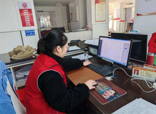 圖為志愿者在電腦上填錄連家溝社區居民的居住積分。王錦儀 供圖