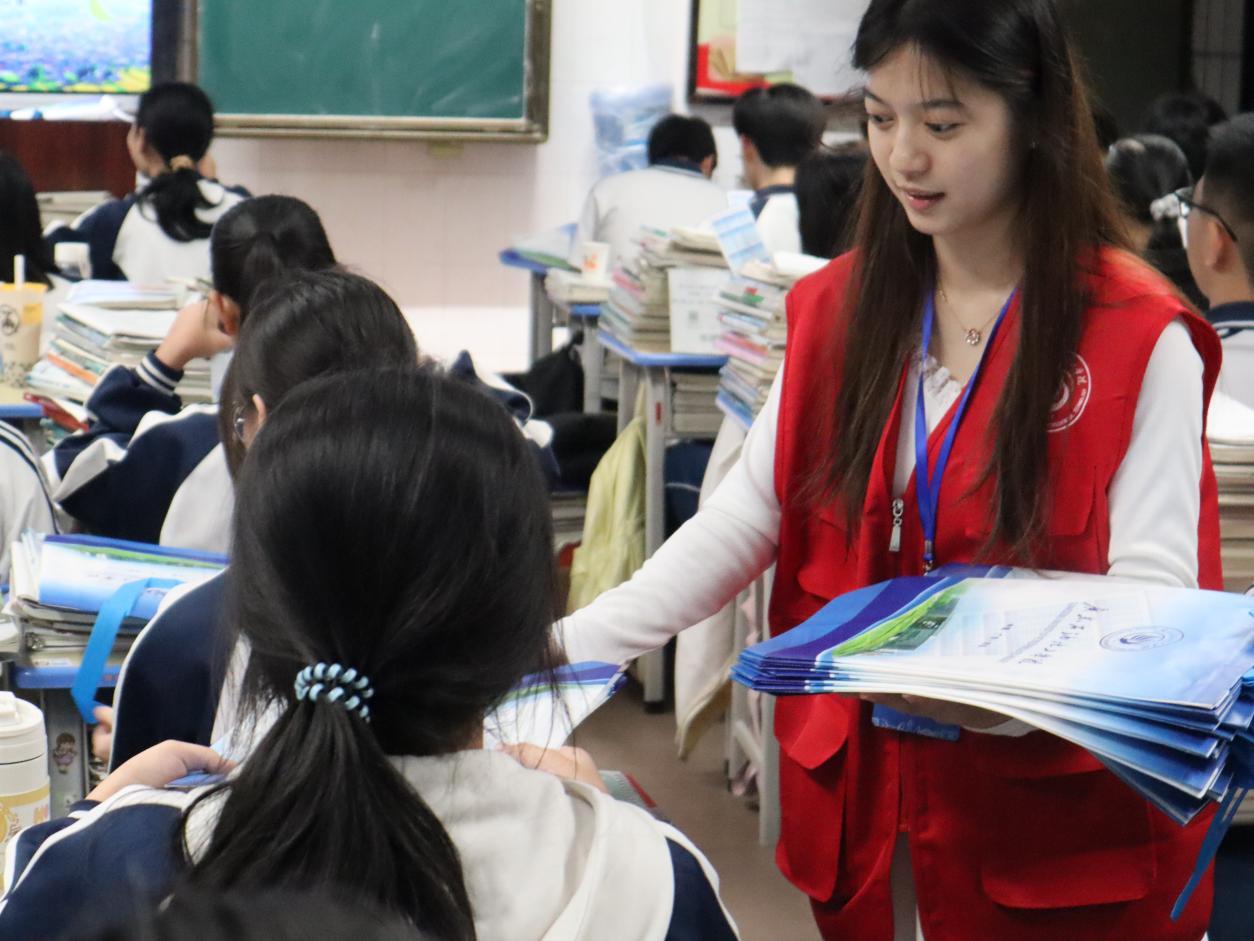 圖為實踐隊成員給學弟學妹們分發宣傳手冊和宣傳袋的場景