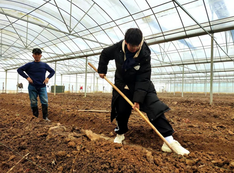 2月6號,實踐隊隊員幫助當地農戶翻耕土垡。翟重慶 攝