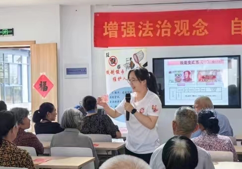 接下來,反假幣宣講員王培菊熱情洋溢地向大家介紹了各版各券別人民幣紙幣的票面主景圖案、防偽特征以及識別方法等相關知識,并邀請爺爺奶奶們近距離觀察和感受。