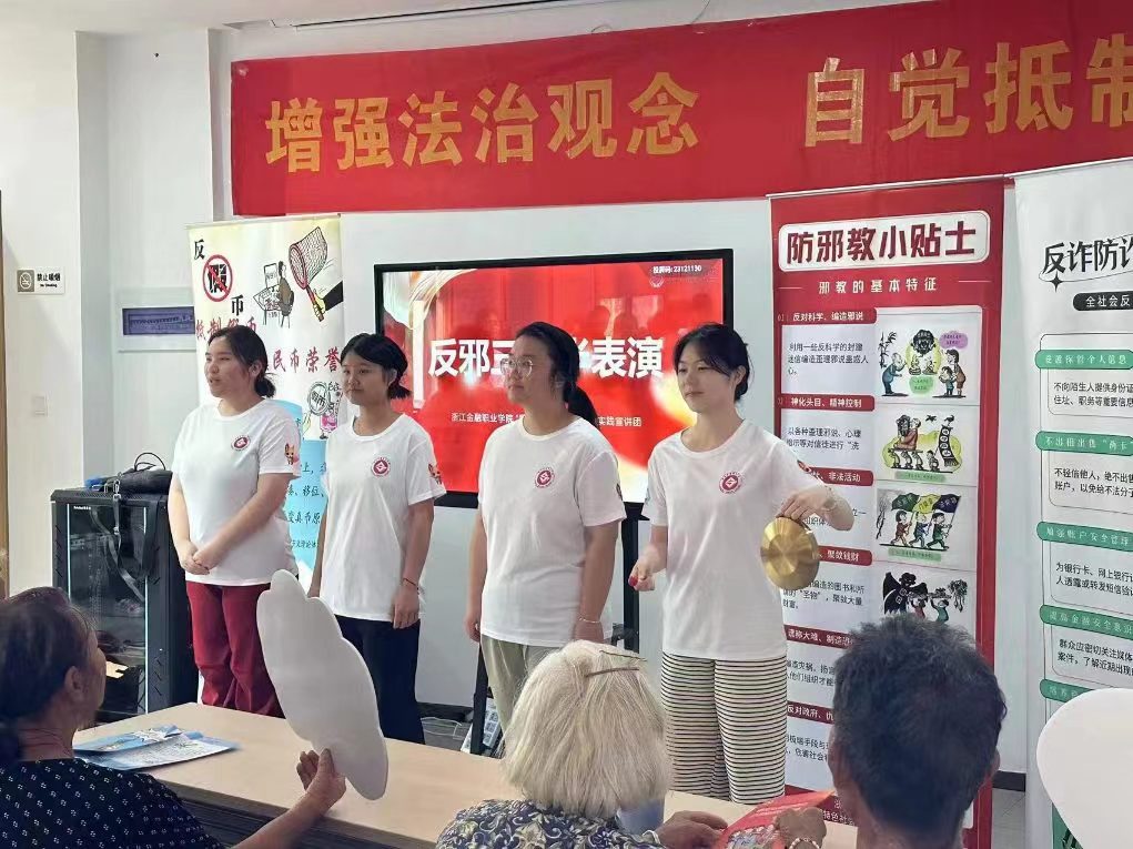 為增加法治教育,擴大反邪教意識,7月1日上午,浙江金融職業學院馬克思主義學院中國特色社會主義理論體系研讀會、反邪教協會暑期實踐團于桐廬莪山畬族鄉老年學校開展了反邪教、反假幣、反詐騙的“三反”宣傳教育活動。