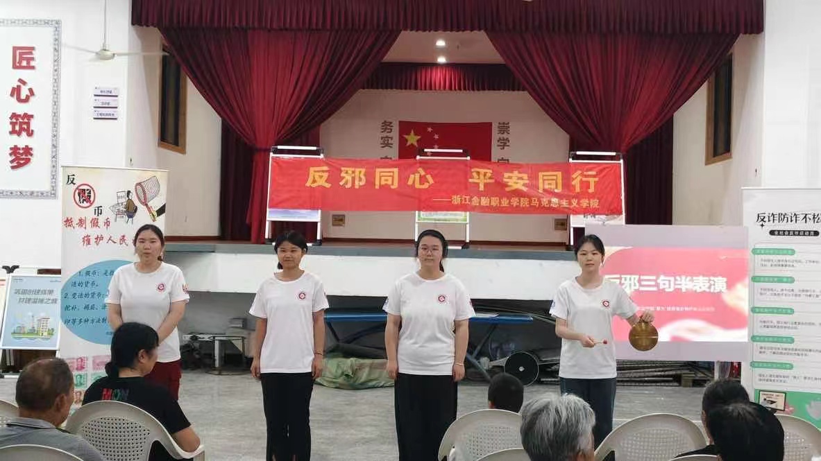 首先上場的是黃玲敏,她以清脆的嗓音,將反邪教的知識編成了朗朗上口的順口溜,讓村民們聽得津津有味;吳亞南、吳瑩瑩等四人采用反邪“三句半”的形式,將道理融入到詼諧的表演中,引得村民們掌聲連連。