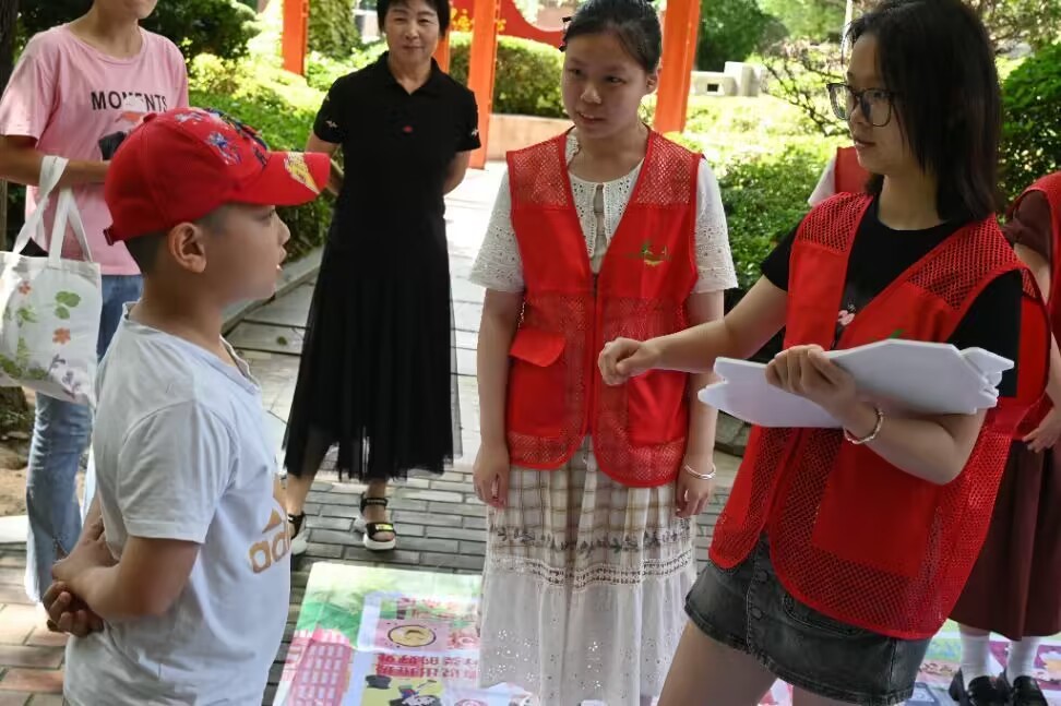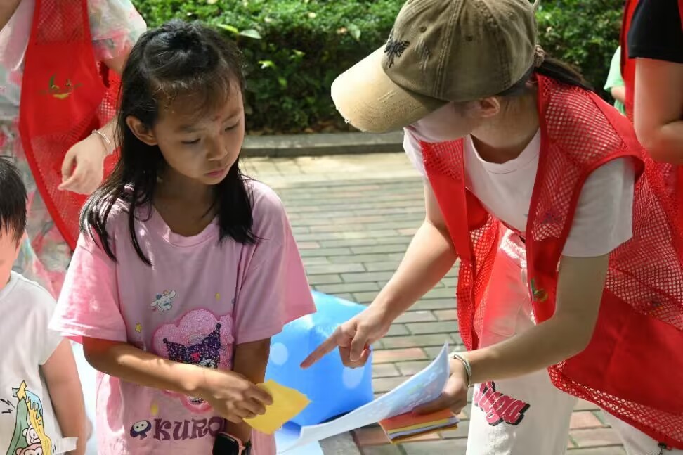 圖為志愿者對(duì)回答正確的小朋友進(jìn)行表?yè)P(yáng)。只此青綠志愿服務(wù)隊(duì) 李林炎 供圖