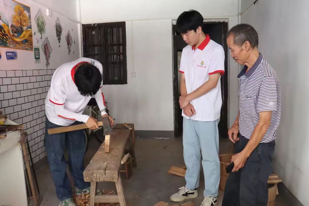 實踐隊近距離感受非遺文化魅力,見證中華民族文化的綿延傳承。踏進街區內的非遺手工坊。店內陳列由樟樹精心雕琢而成的木雕作品。每一刀、每一鑿,皆凝聚著木匠師傅們高深的功力以及對傳統文化的執著堅守。非遺傳承人老爺爺感慨道,這門木匠手藝已然傳承了一千多年。