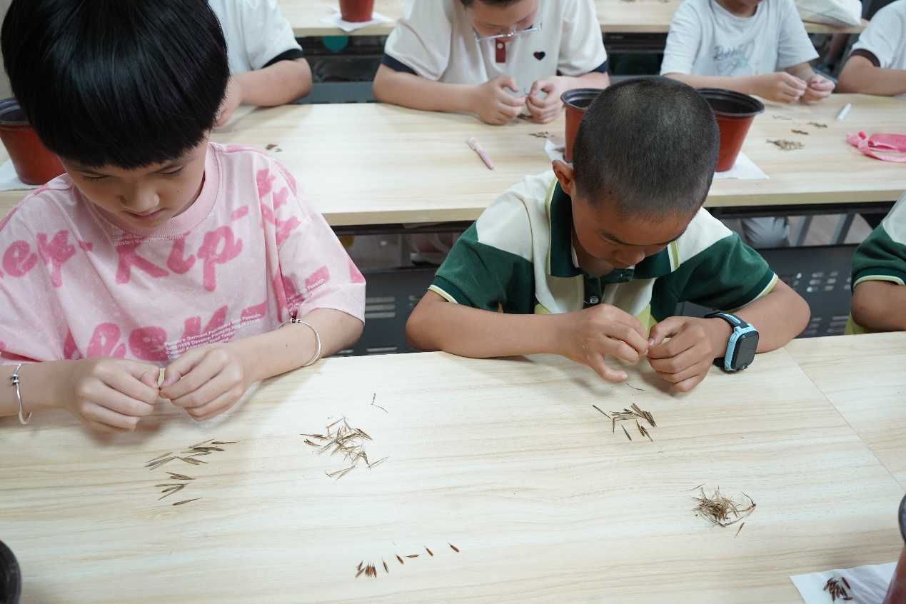 孩子們在實踐團成員的指導下剝開一粒粒竹種的外皮,小心翼翼地放入自己的小花盆中,并花盆上寫下給竹子起的名字,期待幾周之后種子萌發破土而出。“老師,它什么時候會長出來呀”“老師,我可以把我的竹子帶回家養嗎”,大山里的科學教室回響著孩子們充滿求知欲的提問。“識竹米,播竹種”活動引起了孩子們的熱烈反響。