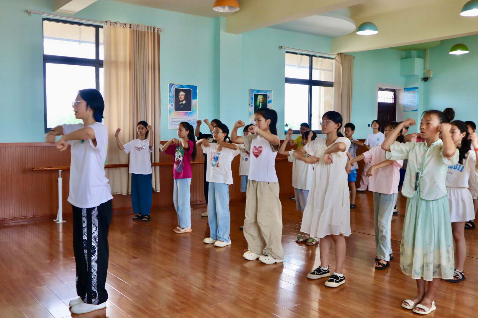 藝術類課程包括聲樂與舞蹈。在聲樂課上,實踐隊隊員劉晉宏分享了一些簡單的樂理知識,講解了音符的種類,指導學生們進行音階小練習。針對不同年齡段的學生,劉晉宏安排了不同的學習歌曲,三四年級學習了經(jīng)典兒歌《哆來咪》,五年級的學生們學習了歌曲《生如夏花》。聲樂課不僅是音樂的盛宴,更是心靈與夢想的交流橋梁,為學生們打開一扇通往音樂殿堂的大門。在舞蹈課上,實踐隊隊員曾雯首先帶領學生進行了基礎的熱身運動,詳細介紹并分步教學街舞的簡單舞步,學生們跟隨她的節(jié)奏,感受舞蹈的韻律與美感。