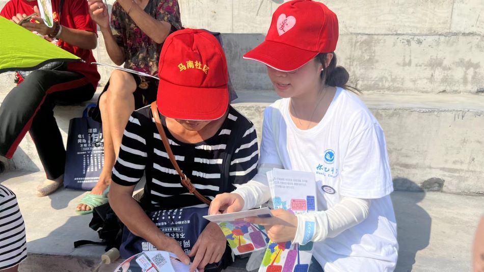 首先,“三公”志愿服務團的成員們向觀看龍舟比賽的觀眾、外地游客已經工作人員發放宣傳冊,并宣傳“全面推行河長制”以及號召所有人一同保護母親河,同時發放法律援助團扇,進行普法工作。沿著這條河,擺滿了提供免費服務的服務點,他們為參賽選手以及其他人提供水、藿香正氣水等等必需品,是整個比賽的后備力量。隨后,我們在黃會長的帶領下,“三公”志愿服務團的成員們來到一個志愿服務臺,并在這里向有需要的人提供服務。