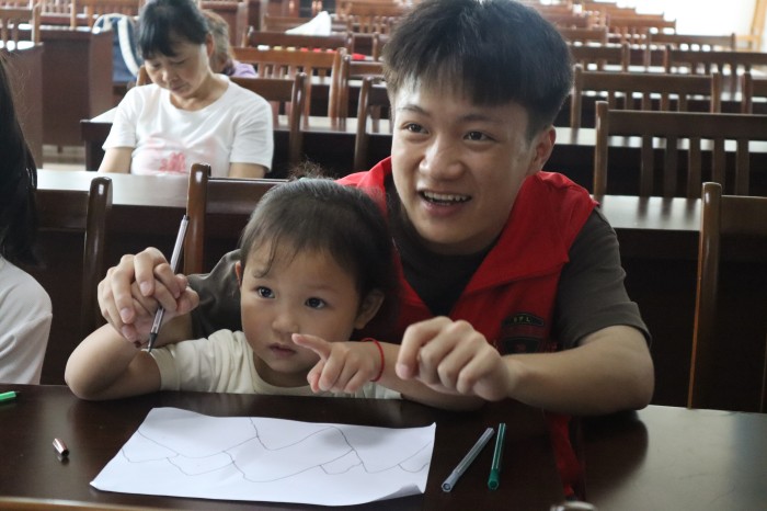 在實際操作中,實踐團的成員們在旁邊耐心指導,時而幫助調整拿筆的姿勢,時而解答疑惑,確保孩子們能充分體驗水墨畫的樂趣。此外,創作過程中孩子們的專注力不禁令我們驚嘆,他們用稚嫩的畫筆,描繪出自己心中的山水,每一幅畫都充滿了屬于他們這個年紀的童趣和靈氣,整個活動現場充滿了歡聲笑語和濃厚的藝術氛圍。