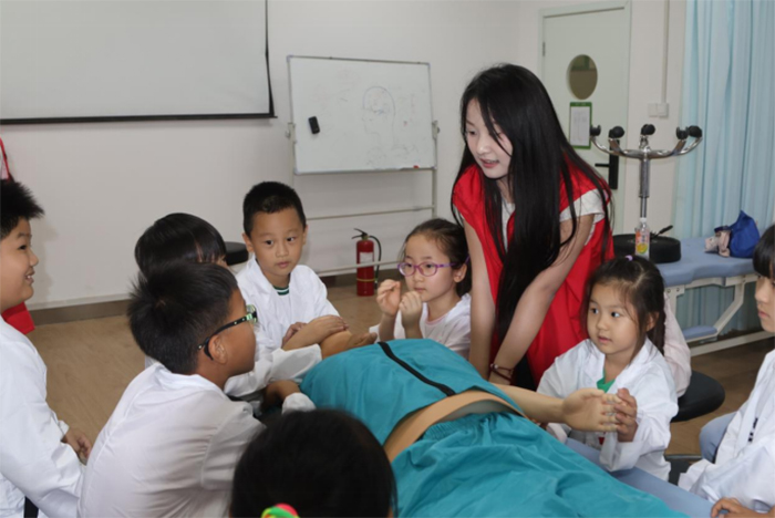 在康復醫學院,志愿者們教授了孩子們海姆立克急救法、心肺復蘇和人工呼吸等急救技能,結合實際例子,使用簡單易懂的語言向小學生們解釋復雜的醫學概念,并通過互動演示,讓小學生們親身體驗醫學操作,并鼓勵他們親自動手實踐。孩子們通過實踐操作,不僅掌握了急救技能,還深刻感受到了醫學的魅力和責任。