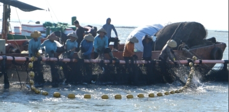 (圖為海上網箱工作人員收網 張瀚月攝)