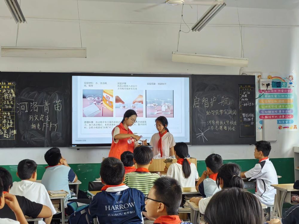 在為期一周的實踐活動中,助學(xué)筑夢實踐團積極投入各項教學(xué)工作,與大所學(xué)校的孩子們度過了一段難忘的日子。期間,工科專業(yè)的實踐團成員為五年級的孩子們上了一節(jié)名為“物理趣味小實驗”的課,引導(dǎo)孩子們動手實驗,遨游在物理的海洋中,通過一系列有趣的物理實驗,探索物理世界的奧秘。在實踐團成員引領(lǐng)孩子們做與大氣壓強有關(guān)的實驗時,“老師”問道:“你們了解大氣壓強嗎?”“老師“的話音剛落,教室里就響起了孩子們七嘴八舌地討論聲和孩子們唰唰地舉手聲,他們亮閃閃的眼睛里滿是對知識的渴望。而實踐是檢驗真理的唯一標(biāo)準(zhǔn),“老師”講解了相關(guān)知識與實驗流程后便邀請了幾位同學(xué)到講臺上來親自動手做實驗,讓他們自己觀察實驗現(xiàn)象,同學(xué)們兩兩配合,在實踐團成員的指導(dǎo)下很快就成功完成了實驗。整節(jié)課的氛圍都輕松愉悅,課后被采訪的一名小學(xué)生說:“我學(xué)會了很多知識,比如蠟燭燃燒要消耗氧氣、丁達爾效應(yīng)……”除探索物理奧秘外,實踐團成員還帶領(lǐng)孩子們走進美術(shù)殿堂領(lǐng)略藝術(shù)之美;踏進洛博珍寶館探尋珍寶的故事;穿越回古代與文學(xué)家進行跨越時空的對話。