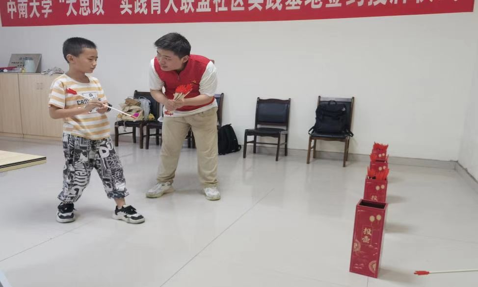 第三個(gè)環(huán)節(jié)是“巧投壺”,是協(xié)調(diào)和控制的挑戰(zhàn)。在這個(gè)環(huán)節(jié)中,孩子們需要將橡膠箭投入小巧的壺中,考驗(yàn)小朋友們的手眼協(xié)調(diào)能力和手部力量控制能力。志愿者們教會(huì)了孩子們?nèi)绾握{(diào)整自己的手勢(shì)和力度,使得每一次投擲都能更加精準(zhǔn)。