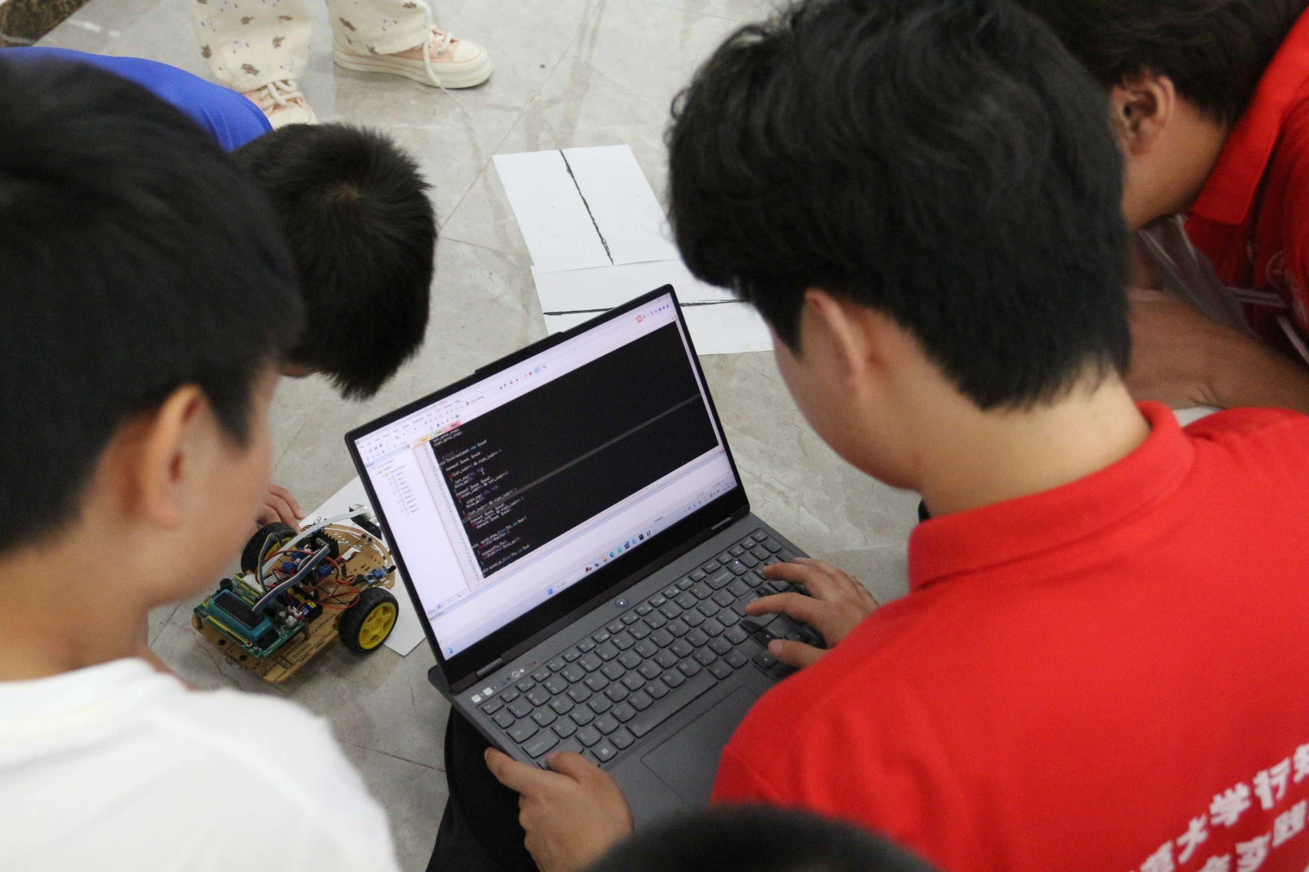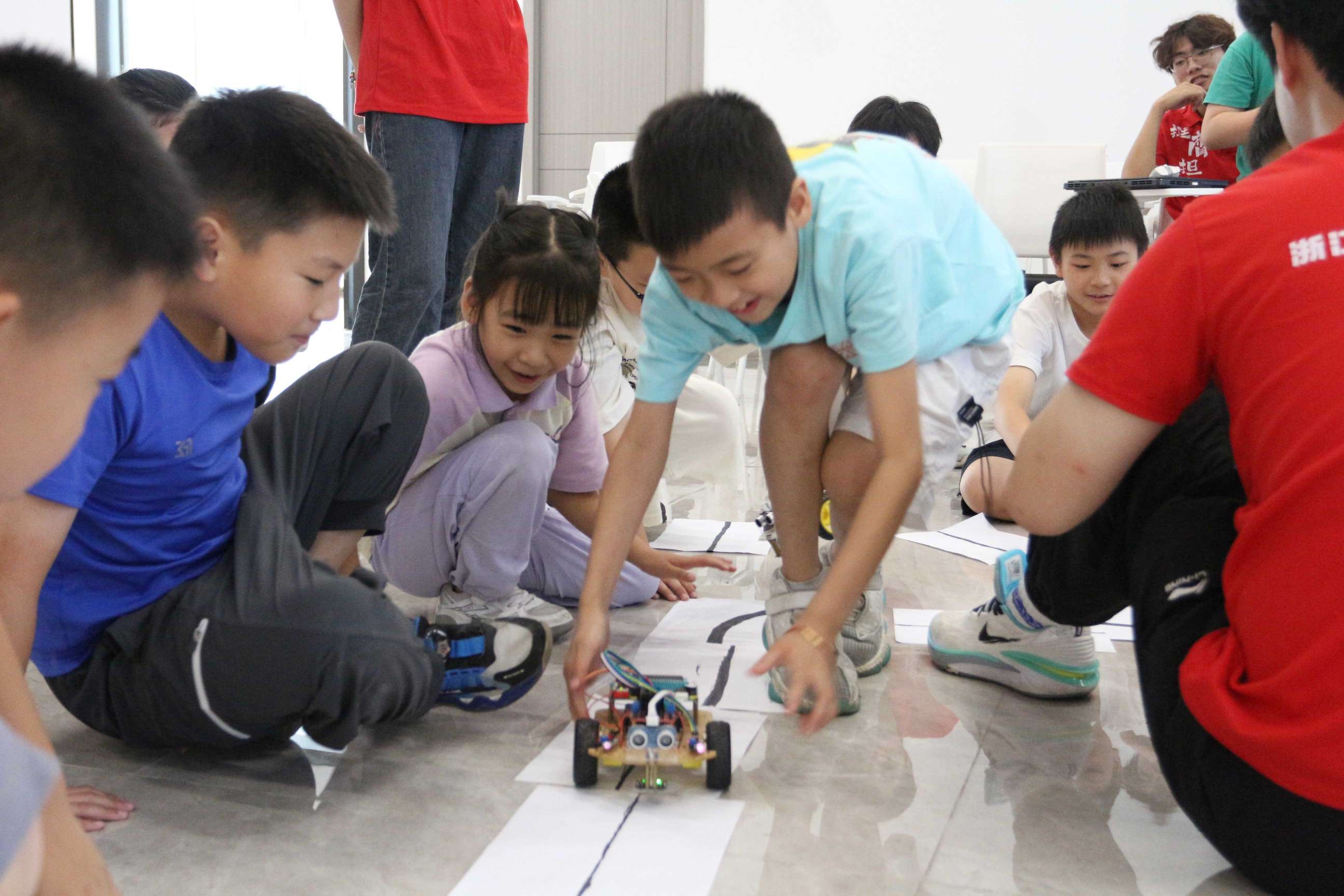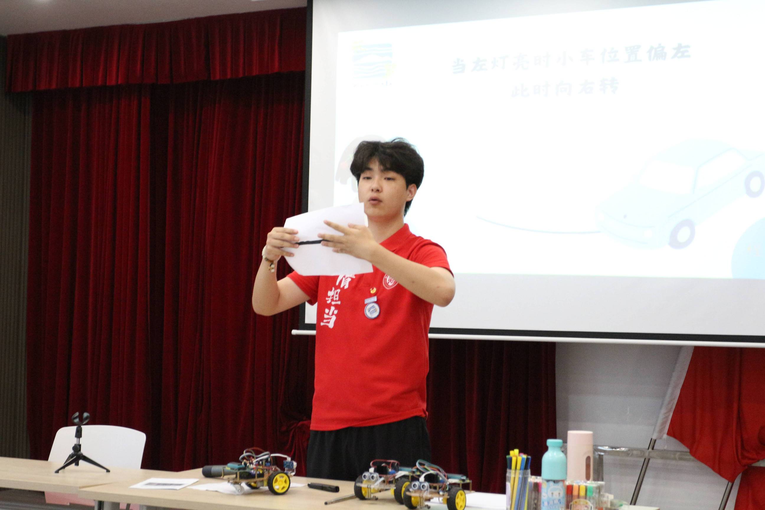 課上,實踐隊員們打開自帶的寶藏“小推車”,各式各樣的汽車模型配件,立馬吸引了在場的孩子們。今天科普“小推車”帶來的是無人駕駛中的智能循跡。給模型車內(nèi)置系統(tǒng)進行軌跡編碼,實現(xiàn)汽車在固定程序范圍內(nèi)的無人操控。目前這項技術(shù)廣泛運用在配送機器人、智能傳輸?shù)阮I(lǐng)域。孩子們一邊認真地聽著實踐隊員關(guān)于循跡小車基本原理與機制的講解,一邊對組裝過程中遇到的問題進行提問:“哥哥,如果小汽車跑出軌道了怎么辦?”“如果模型汽車撞到東西了,會壞嗎?”“小汽車以后能送我上學嗎?”,一起解析,共同組裝和調(diào)試,充分激發(fā)了孩子們的求知探索欲望,最后,在大家的共同努力下,小車也逐漸展現(xiàn)出了穩(wěn)定的循跡能力。在不斷地實驗過后,他們的小車都能做到在指定的“賽道”上穩(wěn)定“循跡”。一堂簡短的科普實驗課,向孩子們解析了一個簡單的智能傳導程序是如何實現(xiàn)的,其中融匯了模型的簡介、編程的構(gòu)架、運行的基本的原理和運動軌跡的機制。眾多科學小知識在實踐探索中被逐個解碼。