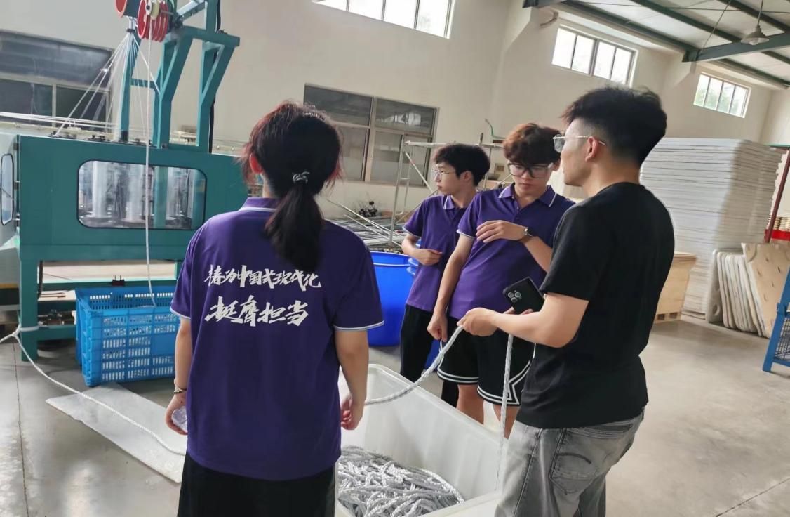 對于機械專業的團隊成員們來說,廠里的機器并不陌生。任廠長介紹完安全繩的編織全過程后,團隊成員們迫不及待地開始實踐操作,親身感受工人的工作。相比于傳統手搖編織,機械自動化編織的安全繩更加牢靠、繩股與繩股之間結合地更緊密,同時生產效率也更高。看到任廠長臉上的自豪,更加使團隊成員們意識到“工業強,則國強。”這句話的深刻內涵。