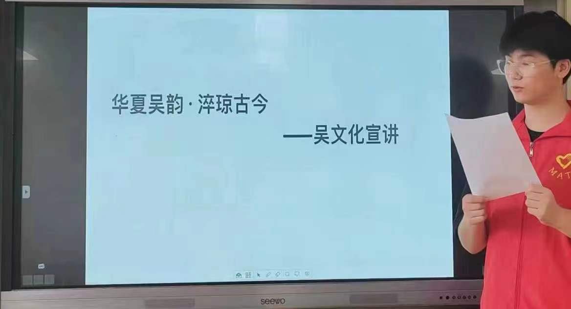 叁·辦宣講,弘揚吳韻文化傳承實踐團隊成員來到江陰市長山中學,貼心的為同學們進行了有關吳韻文化的宣講:梅里古鎮的名字來源于梅里這個地名,很多人以為梅里是后來人為這個古鎮起的名字,其實不然,梅里指的是商末周初吳國的都城,這里繁華巍峨留存了非常多那個時代的遺跡和文物,而且燦爛悠久的吳越文化也是在這個時代在這片土地上孕育傳承下來的。所以站在無錫梅里這個地方,總能感受到無處不在的吳越文明,能夠感受帶從千年以前流淌而來的涓涓歷史。