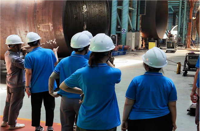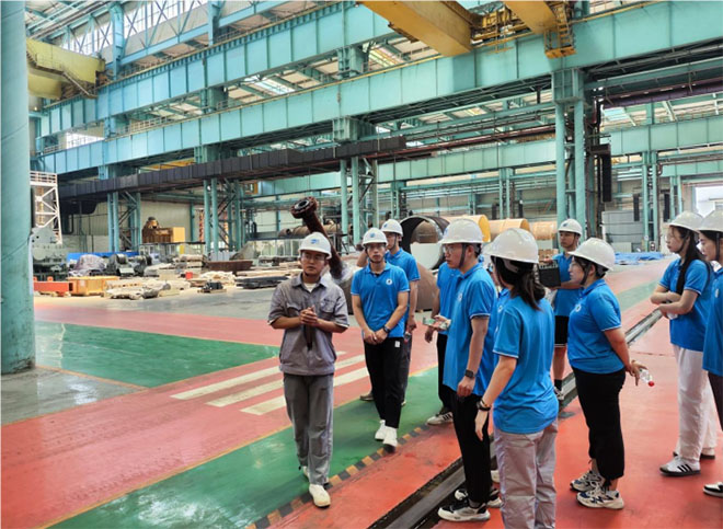 7月4日上午,實踐團趕赴二重(鎮江)重型裝備有限責任公司開展參觀調研活動。在了解了公司規模及主要業務后,人事部李經理和生產部楊工一起帶領隊員們參觀了機加工車間。穿過安全通道并進入機加工車間后,隊員們映入眼簾的是各式各樣的大型落地鏜床、數控立車等機加設備,以及大型行車、大規格熱處理爐、射線探傷室等大型輔助設備,這些先進的機加工設備在加工超大、超重的“雙超”工業產品方面起著至關重要的作用。