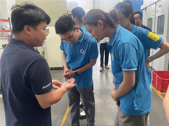 通過這次參觀調研,隊員們認識到阿雷蒙公司在沖壓件制造方面表現出色,其卓越的技術和嚴格的質量控制樹立了行業標桿。在與車間主任的交談中隊員們得知,公司引進了最先進的沖壓設備和工藝,采用高精度的模具設計和制造技術,確保每一件沖壓件都具備極高的精度。在生產車間參觀過程之后,隊員們對于公司不斷的技術創新與工藝改進和在沖壓件的材料選擇、表面處理和加工工藝上的深入研究有了新的感悟。