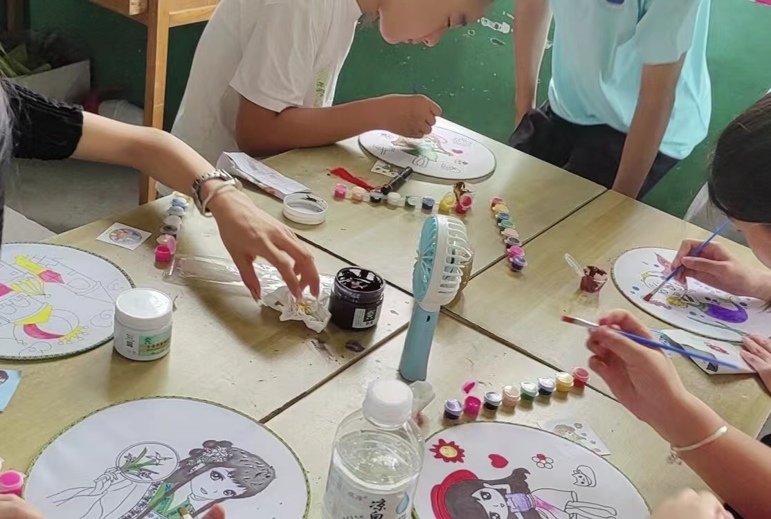 首先進行的是“創意畫扇”環節。服務團的志愿者們將一把把空白的扇子分發到孩子們手中,鼓勵他們發揮無限想象,用五彩斑斕的畫筆在扇面上描繪出自己的夢想與希望。