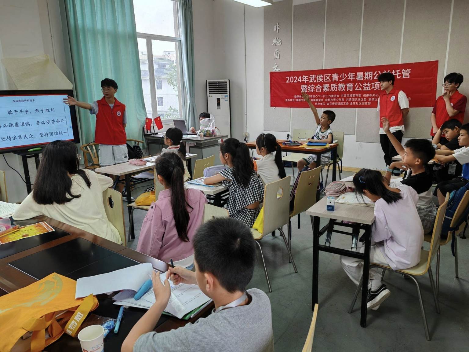 在活動開始之前,志愿者們提前到達金花社區(qū)與社區(qū)工作者進行工作對接,進行流程梳理。活動開始后,由主講人帶領(lǐng)小朋友們從了解西柏坡的歷史淵源和精神內(nèi)涵再到西柏坡當代踐行者們的故事來走進西柏坡。活動過程中,主講人設(shè)置了有趣的互動環(huán)節(jié),主講人通過提問的方式來加深小朋友對于西柏坡精神的理解。除此以外,志愿者們還準備了紙和筆,和小朋友們一起繪畫有關(guān)西柏坡的簡筆畫。活動結(jié)束后,志愿者們和小朋友一起拿著作品進行合照,一幅幅簡筆畫上承載的是幼小的心靈對于國家強盛的美好祝福。