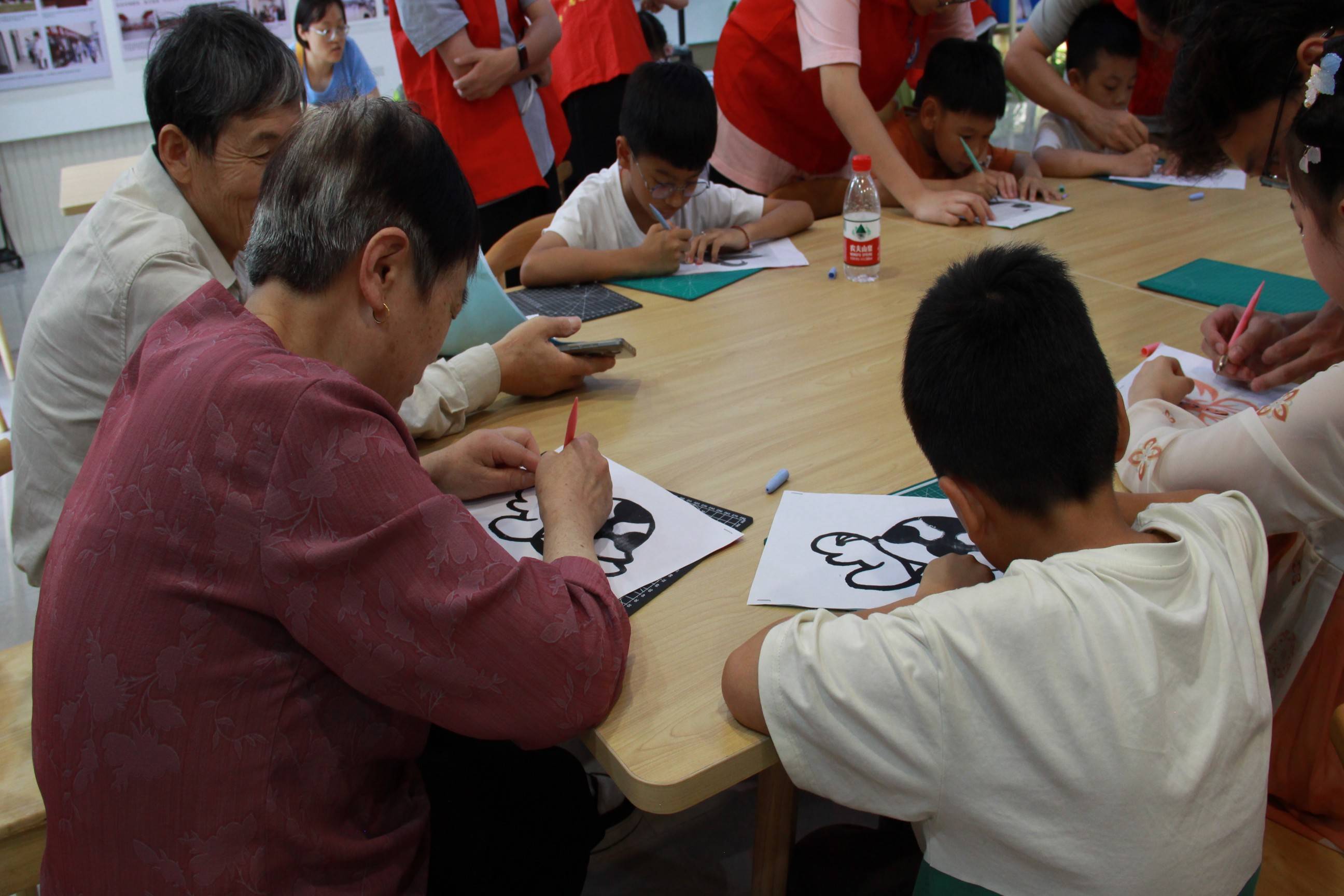 圖為新龍湖社區活動,蔣豪小朋友的祖父母陪同孫子一起體驗刻紙制作。 多彩大學生網通訊員江雨震 攝