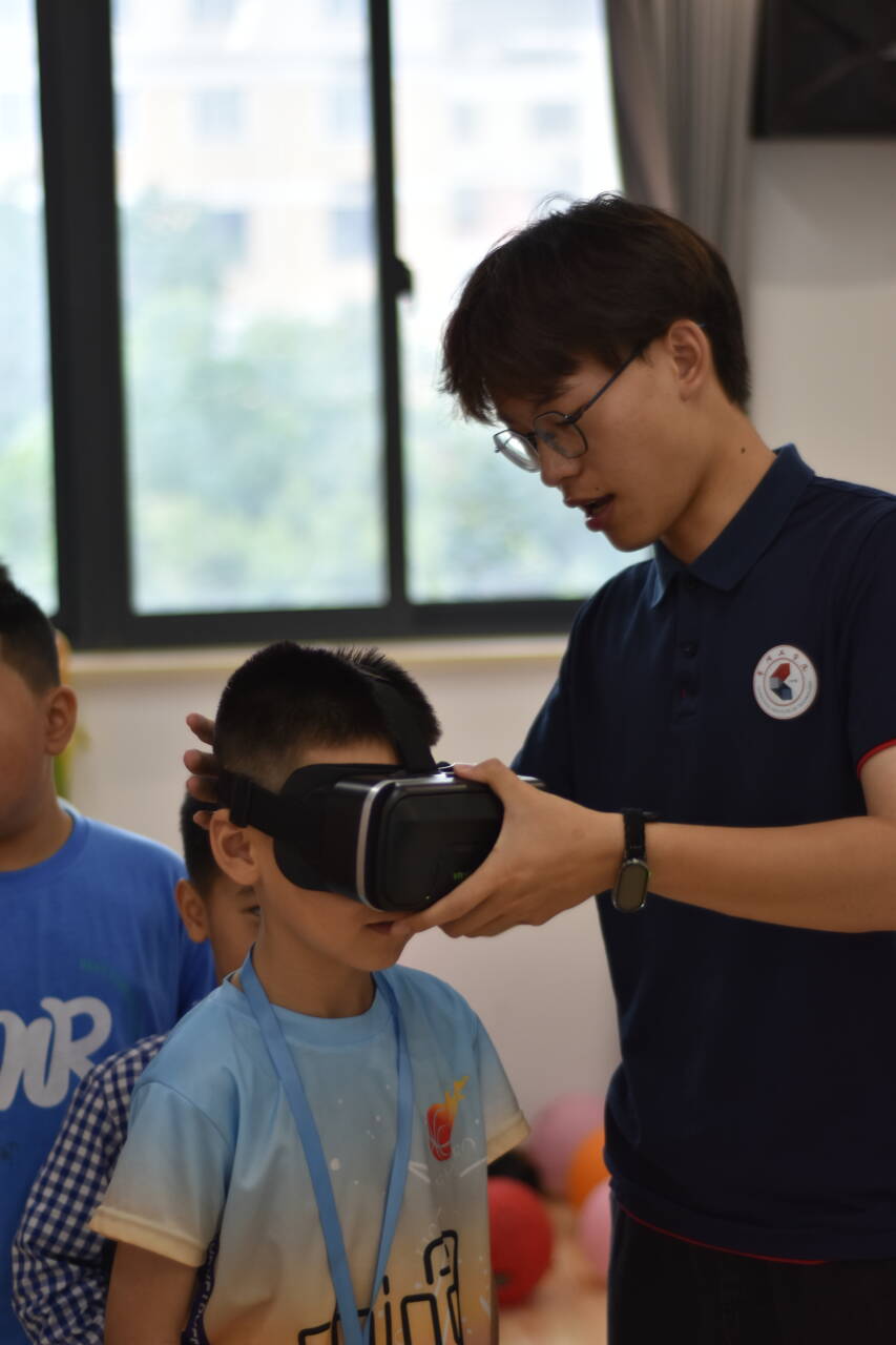 圖為團(tuán)隊(duì)成員幫助小朋友體驗(yàn)VR線上刻紙展館 團(tuán)隊(duì)成員蘇家豪 攝