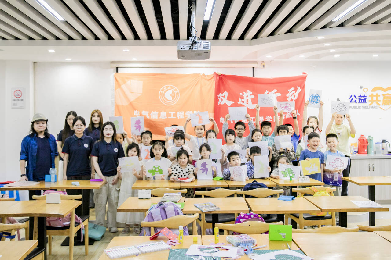 圖為小朋友們展示自己的作品并與團(tuán)隊(duì)成員們合影 團(tuán)隊(duì)成員蘇家豪 攝