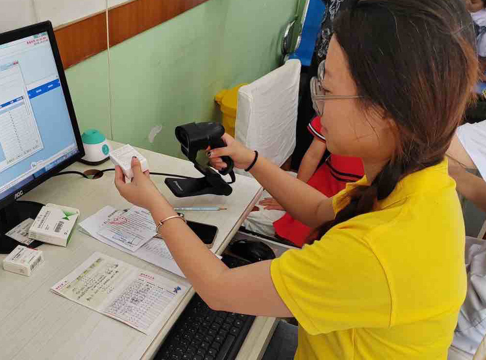 (圖為志愿者協(xié)助醫(yī)護(hù)人員錄入疫苗信息)